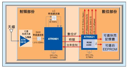 GPS基频处理器ATR0621包括一个16通道GPS相关器,该基频处理器采用ARM7TDMI处理器核心,具有128kB内部SRAM384kB内部ROM,在这个ROM中包括全部的GPS韧体,由u-blox公司授权,用来执行基本的GPS处理,包括追踪、获取、导航和定位数据输出。对普通的PVT(位置/速度/时间)应用,不需要外部闪存或ROM。韧体支持在可选的外部EEPROM中储存可能的配置设置,对于特定的用户应用提供一套软件开发套件。基频具有不同的接口以方便灵活的系统整合(2USARTUSB 2.0SPIGPIO),而且透过不同的省电模式提供先进的功率管理。