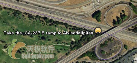“Fly To”和“Local Search”就不具体介绍了,直接在搜索框里输入英文地名,就会给出一堆结果,然后在里面筛选自己要的东西。这里我们要看一下“Directions”,它可以用来显示两个地点之间的行车路线,为了方便,在这里我们以Google公司到Yahoo公司的路线为例(两公司相距很近,如下图)。