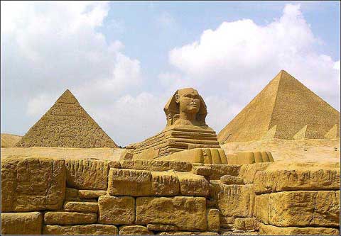胡夫金字塔是10座金字塔中最大的一座。在海夫拉金字塔前面匍伏着一座巨大的狮身人面石雕像。